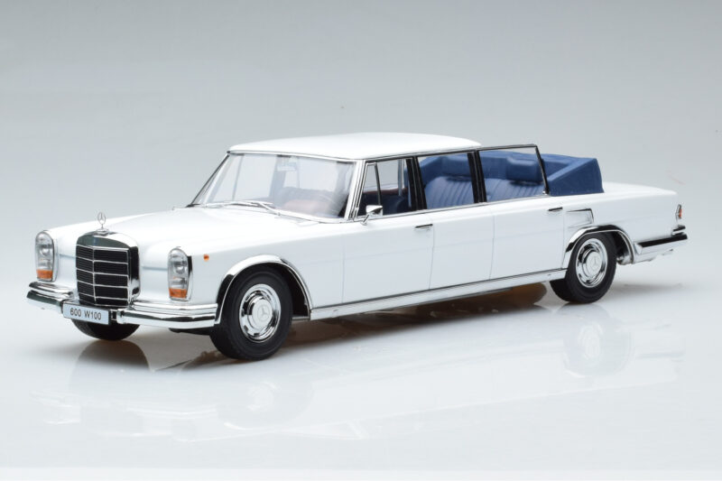 The Mercedes 600 Pullman W100 Landaulet Weiß KK-Scale 1:18 is crafted from Metall. Die-cast zinc alloy body with detailed plastic parts, rubber tires, and high-quality paint finish. Die-cast models are known for their weight, durability, and realistic feel.