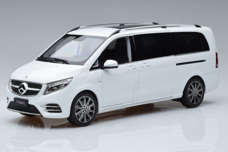 The Mercedes V-Class W447 V260L Weiß Mercedes 1:18 is crafted from Metall. Die-cast zinc alloy body with detailed plastic parts, rubber tires, and high-quality paint finish. Die-cast models are known for their weight, durability, and realistic feel.