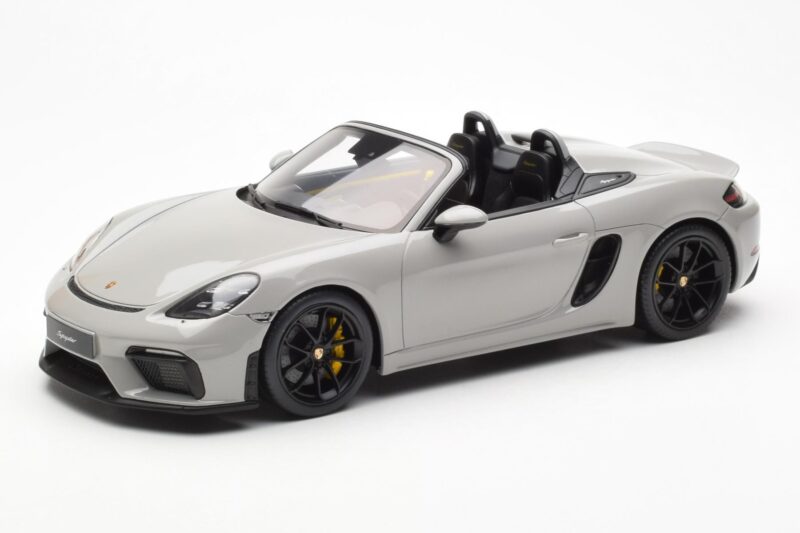 A 1:18 scale model measures approximately 25-28 cm (approximately 10-11 inches). The Porsche 718 Spyder Crayon Grau GT Spirit 1:18 is perfect for display in a glass cabinet or on a shelf.