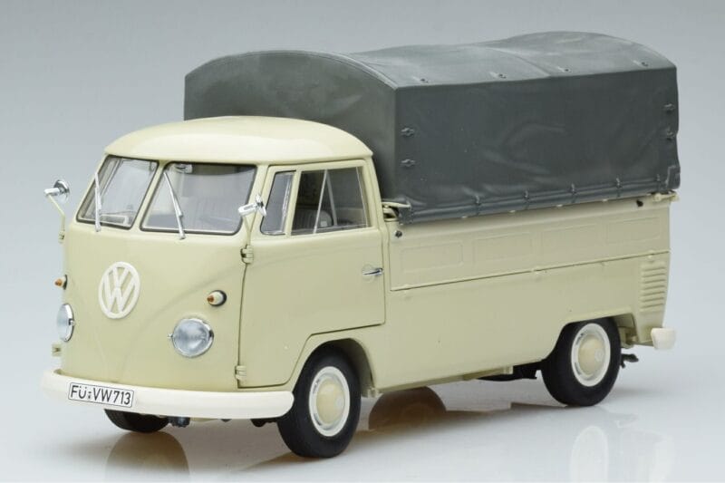The Volkswagen T1b Pickup Schuco 1:18 is crafted from Metall. Die-cast zinc alloy body with detailed plastic parts, rubber tires, and high-quality paint finish. Die-cast models are known for their weight, durability, and realistic feel.