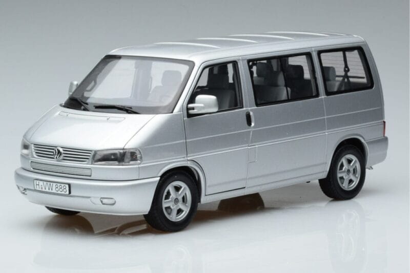 The Volkswagen T4b Transporter Caravelle Minibus Schuco 1:18 is crafted from Metall. Die-cast zinc alloy body with detailed plastic parts, rubber tires, and high-quality paint finish. Die-cast models are known for their weight, durability, and realistic feel.